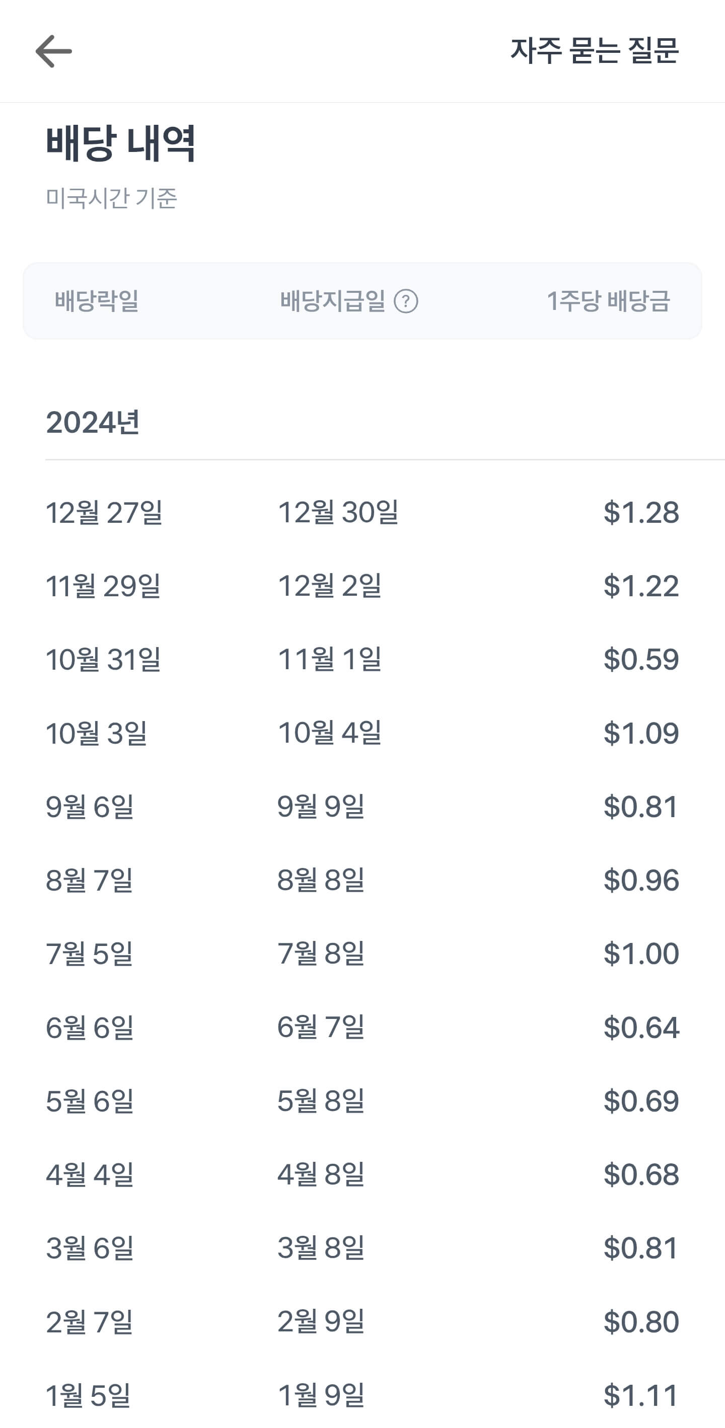 2024년에는 10월에 배당기준일 변경으로 인해 2회 지급하면서 월초에서 월말로 기준이 변경되었습니다.